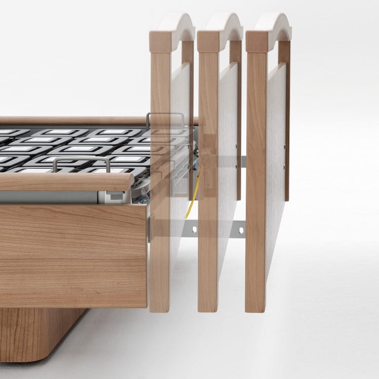 Tous les lits de soins wissner-bosserhoff disposent d‘une rallonge de sommier intégrée. Grâce à la rallonge de sommier Express (ill. ci-dessous/en option), les lits de soins sentida, dotés de demi-barrières latérales de sécurité, s‘adaptent très facilement aux différentes tailles de résidents. Les prescriptions de la nouvelle norme CEI 60601-2-52 sont ainsi respectées quelle que soit la configuration.